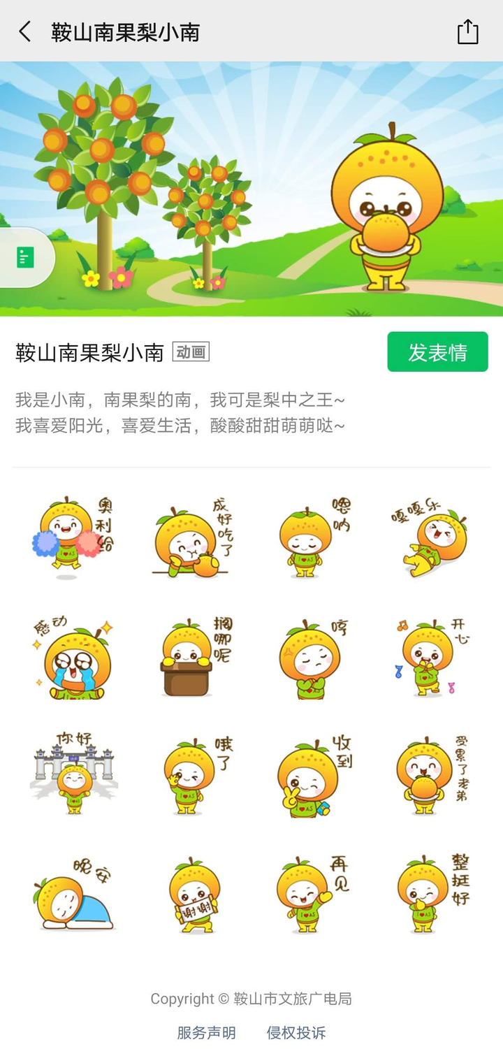 在2020鞍山南果梨文化采摘节到来之际,由市文旅广电局推出的16个鞍山南果梨小南微信表情上线,以新颖的表现形式让鞍山文化旅游品牌更加深入人心。